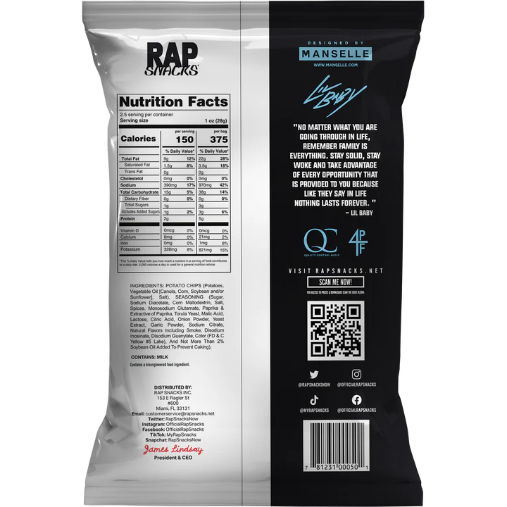 Turn up the heat with Rap Snacks Lil Baby All In Hot Potato Chips (2.5oz)—a fiery take on one of the brand’s most popular flavors. Inspired by rap superstar Lil Baby, these crispy chips bring together the bold fusion of BBQ, salt & vinegar, onion, and garlic—and crank it up with an extra layer of spicy heat.