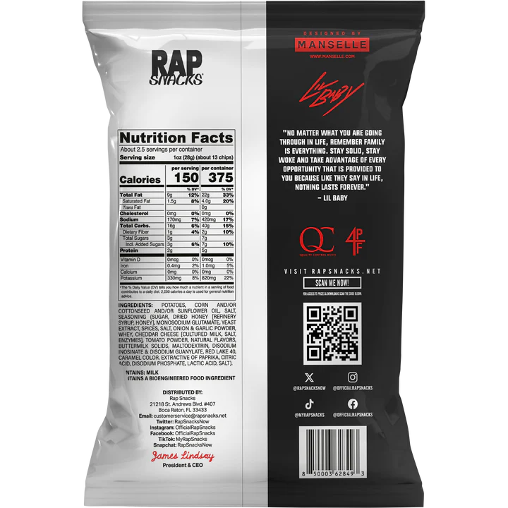 Bring the flavor and the heat with Rap Snacks Lil Baby Bar-B-Quin With My Honey Heat Potato Chips (2.5oz)—a bold snack inspired by rap superstar Lil Baby. These crispy potato chips combine the smoky richness of barbecue, the sweet touch of golden honey, and just the right amount of spicy heat, creating a flavor that’s as unstoppable as Lil Baby himself.